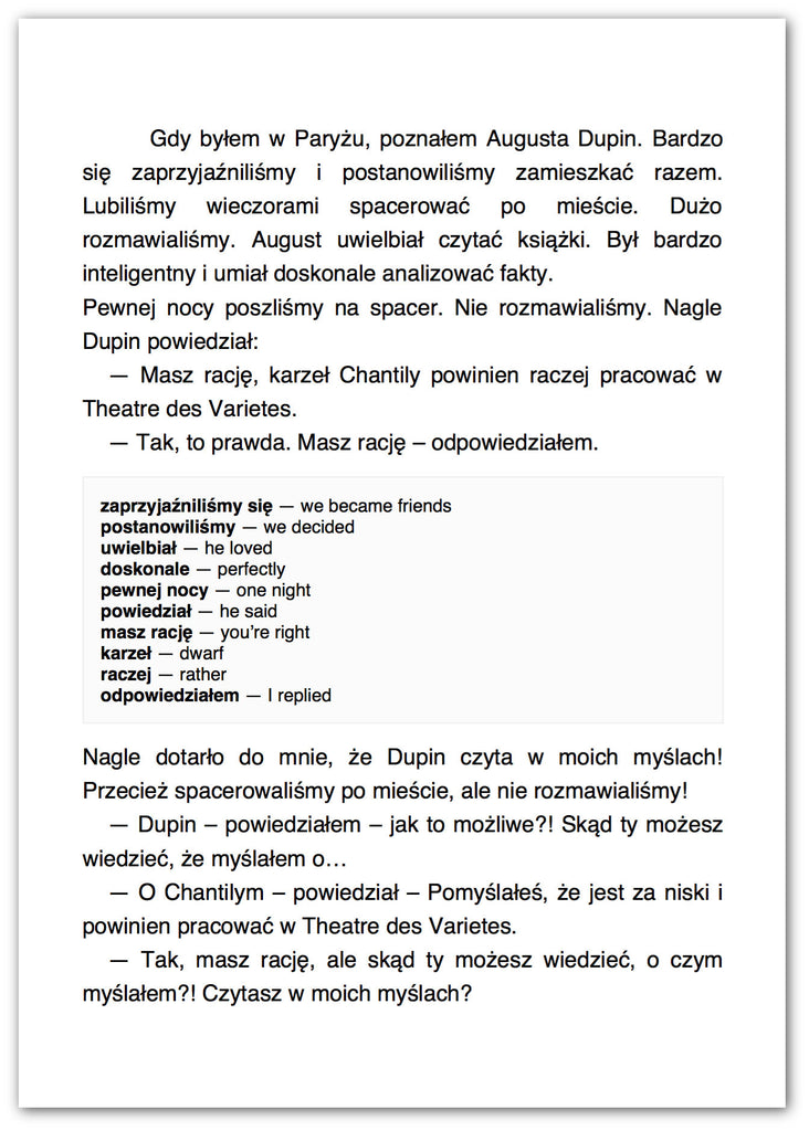 The book is a simplified version of the well known crime story "The Murders in the Rue Morgue". It contains Polish vocabulary boxes with English translations that will reduce the use of a dictionary. It has simple sentences, so that you can follow the plot easily.